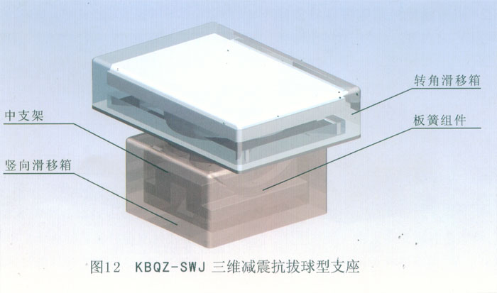 支座結(jié)構(gòu)如圖12。其主要由轉(zhuǎn)角滑移箱、豎向滑移箱、中支架和板簧組件組成。支座中的相對(duì)滑移部件之間,采用目前世界卜摩擦系數(shù)最低的聚四氟乙烯滑板和不銹鋼板相隔,充分減小了摩擦阻力,使各部分之間的運(yùn)動(dòng)流暢,避免爬行現(xiàn)象的產(chǎn)生。本類支座通過轉(zhuǎn)角滑移箱內(nèi)的球面聚四氟乙烯滑板上部構(gòu)件沿著球面相對(duì)于下部構(gòu)件的轉(zhuǎn)動(dòng)實(shí)現(xiàn)轉(zhuǎn)角(常用值為0.02rad),在工作過程中支座沿著轉(zhuǎn)角滑移箱內(nèi)的滑道滑動(dòng)實(shí)現(xiàn)水平位移,沿著豎向滑移箱內(nèi)的滑道滑動(dòng)實(shí)現(xiàn)豎向的位移和減震。