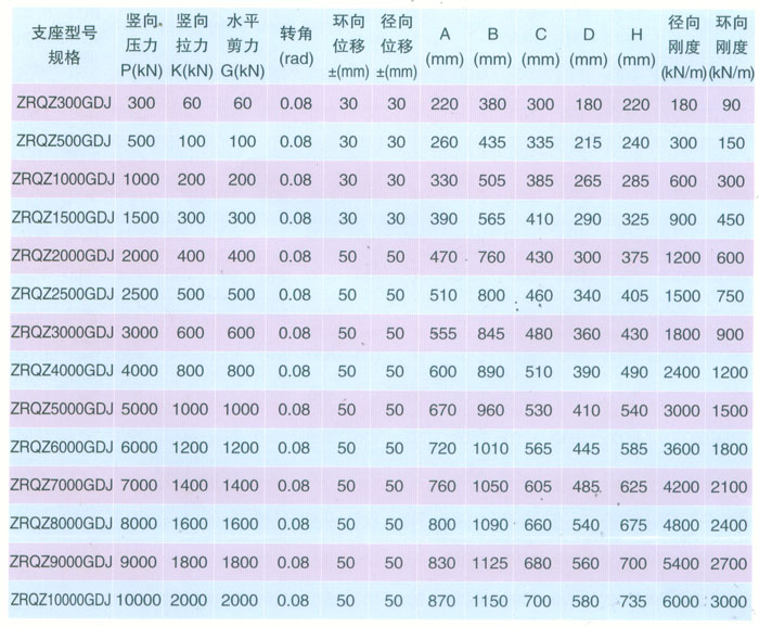 ZRQZ-GDJ固定減震型自潤球鉸支座參數表    表6