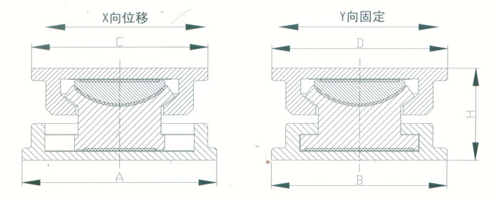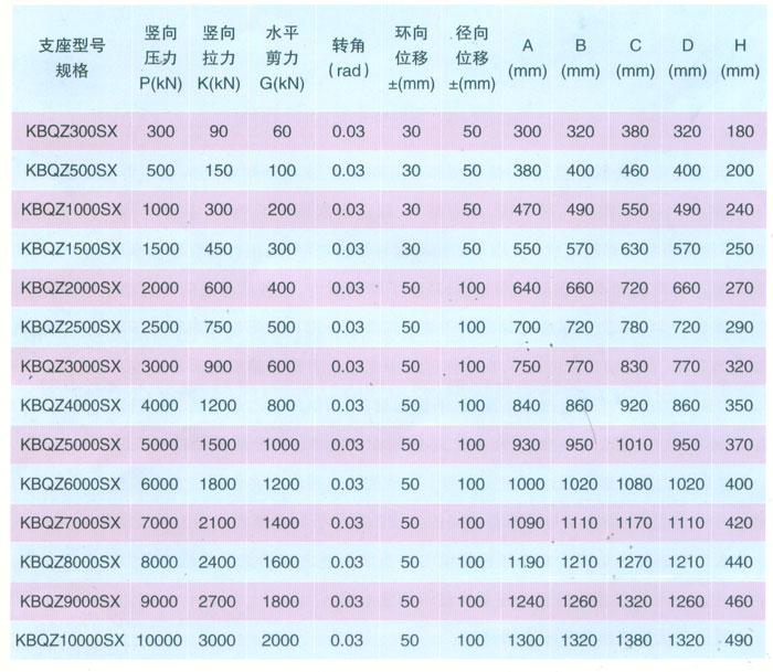 4 KBQZ系列抗拔球型支座 本系列支座主要分為抗拔球型支座和減震抗拔球型支座,下面對其進行分類介紹。4.1抗拔球型支座 此類支座分為固定型、單向位移型和雙向位移型,支座結構如圖3。其主要由支座頂板、不銹鋼板、平面聚四氟乙烯滑板、球冠襯板、球面聚四氟乙烯滑板、中支架、聚四氟乙烯滑板、不銹鋼板和滑移箱組成。支座中的相對滑移部件之間,采用目前世界上摩擦系數最低的聚四氟乙烯滑板和不銹鋼板相隔,充分減小了摩擦阻力,使各部分之間的運動流暢,避免爬行現象的產生。本類支座通過球面聚四氟乙烯滑板上部構件沿著球面相對于下部構件的轉動實現轉角(常用值為0.02rad),在工作過程中支座沿著滑移箱滑道滑動實現水平位移。 豎向壓力的傳遞是通過支座頂板,不銹鋼板,平面聚四氟乙烯滑板,球冠襯板,球面聚四氟乙烯滑板,中支架,聚四氟乙烯滑板,不銹鋼板依次疊加傳至滑移箱底板。 豎向拔力的傳遞是通過支座頂板和中支架的抗拔接觸面將作用于支座頂板上的上.拔力傳至中支架,再由中支架與滑移箱之間的抗拔四氟滑板和不銹鋼板將力傳至滑移箱頂板。 水平力的傳遞是通過支座頂板側壁與中支架側壁之間.的接觸面將水平力傳至中支架,再由中支架與滑移箱的接觸面傳至滑移箱側壁根部。 固定型抗拔球型支座不設滑移箱。4.1.1普通抗拔雙向位移型球型支座KBQZ-SX普通抗拔雙向位移型球型支座參數表 表74.1.2普通抗拔單向位移型球型支座KBQZ-DX普通抗拔單向位移型球型支座參數表 表84.1.3普通抗拔固定型球型支座KBQZ-GD普通抗拔固定型球型支座選用參數表 表9